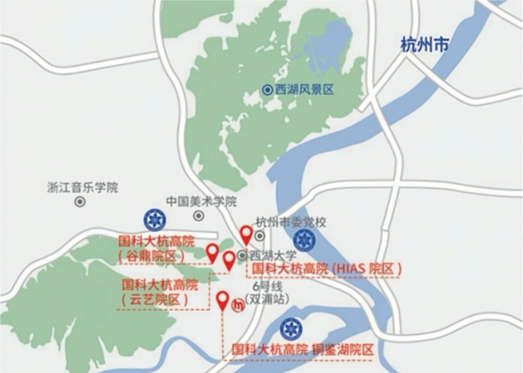杭高院现有云艺院区、谷鼎院区、HIAS院区三个院区。主院区铜鉴湖院区毗邻铜鉴湖,风景秀丽;紧邻地铁6号线双浦站,交通便利。铜鉴湖院区一期建筑面积约55.5万平方米,包括教学科研、学术交流、宿舍公寓等功能区,计划容纳硕博研究生4500名、博士后及教职工近2000名。