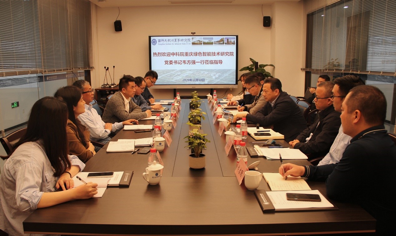 11月18日上午,中国科学院重庆绿色智能技术研究院党委书记、副院长韦方强一行来到国科大杭州高等研究院考察交流,杭高院党委书记马里松陪同调研并出席座谈会。