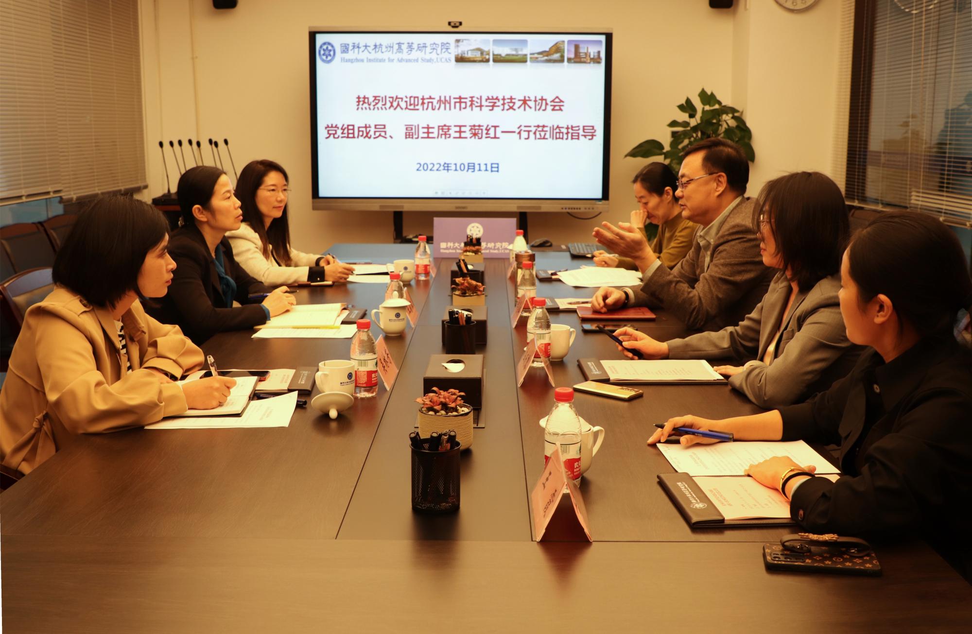10月11日,杭州市科学技术协会党组成员、副主席王菊红一行来国科大杭州高等研究院(以下简称杭高院)考察调研。杭高院党委委员、常务副院长郑崇辉陪同考察并出席座谈会。杭高院党群工作部、科研与平台管理部负责人陪同考察并参加座谈会。
