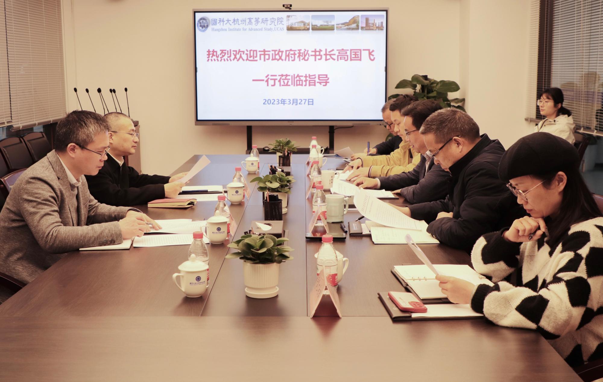 3月27日,杭州市政府党组成员、秘书长高国飞一行莅临我院调研指导。杭高院党委书记邵雪荣,党委委员、纪委书记方晓平出席座谈会。